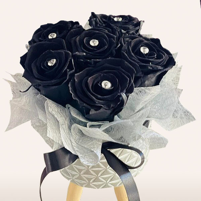 This stunning arrangement of black roses in a vase with diamonds is the perfect gift for someone who appreciates the finer things in life. The forever roses are arranged in a sleek and sophisticated vase, and the diamonds add a touch of luxury and glamour. Black roses are a rare and unique flower, and they symbolize mystery, passion, and allure. This bouquet is sure to turn heads and make a lasting impression on the recipient, that's why we call me magic.