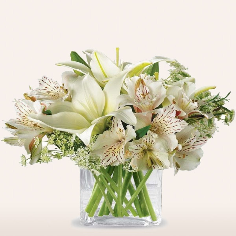 A beautiful way to send sincere thoughts, this gorgeous arrangement features beautiful white lilies, white alstroemeria, queen Anne's lace, lily grass, and curly willow in a clear glass cube vase. A great way to express your condolences and to pay your respects, or simply use for other occasions.