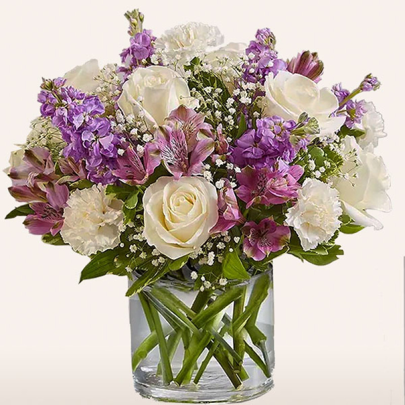 This elegant bouquet is hand-arranged in a sleek glass vase, which perfectly complements the vibrant colors and delicate textures of the flowers. The vase's clean lines and simple design allow the flowers to take center stage, creating a stunning and eye-catching centerpiece.