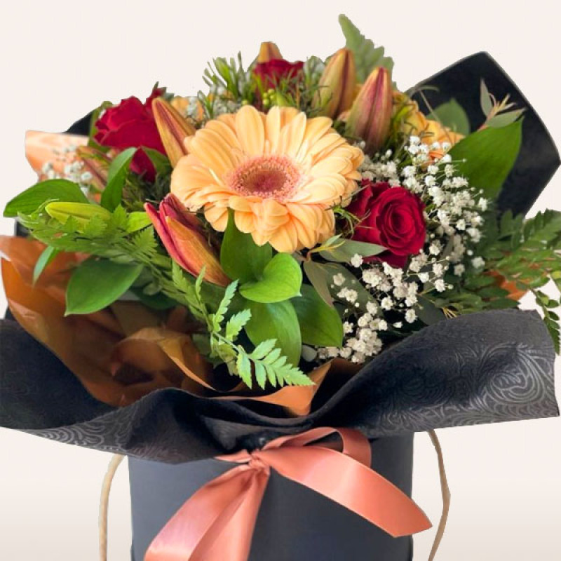 This bouquet is a beautiful arrangement of roses and lilies in a black box. The flowers are tightly designed together in a round shape, and the black box adds a touch of elegance. Our florist's delicate touch makes it perfect for any occasion for loved ones in Cyprus.