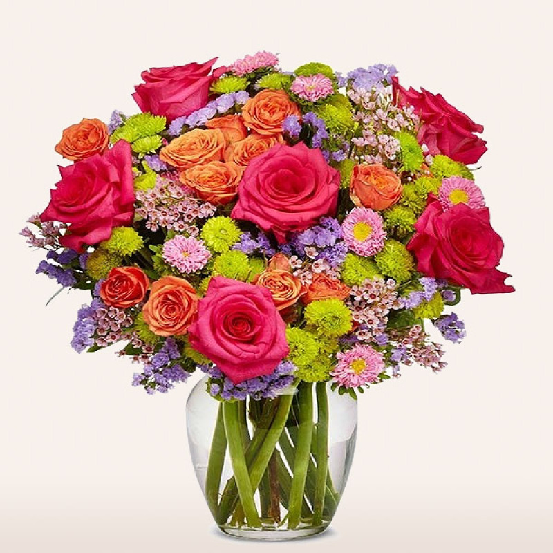 6 pink roses, 10 mini orange roses, pink waxflowers, green button poms, lavender statice, seasonal greens in a vase |